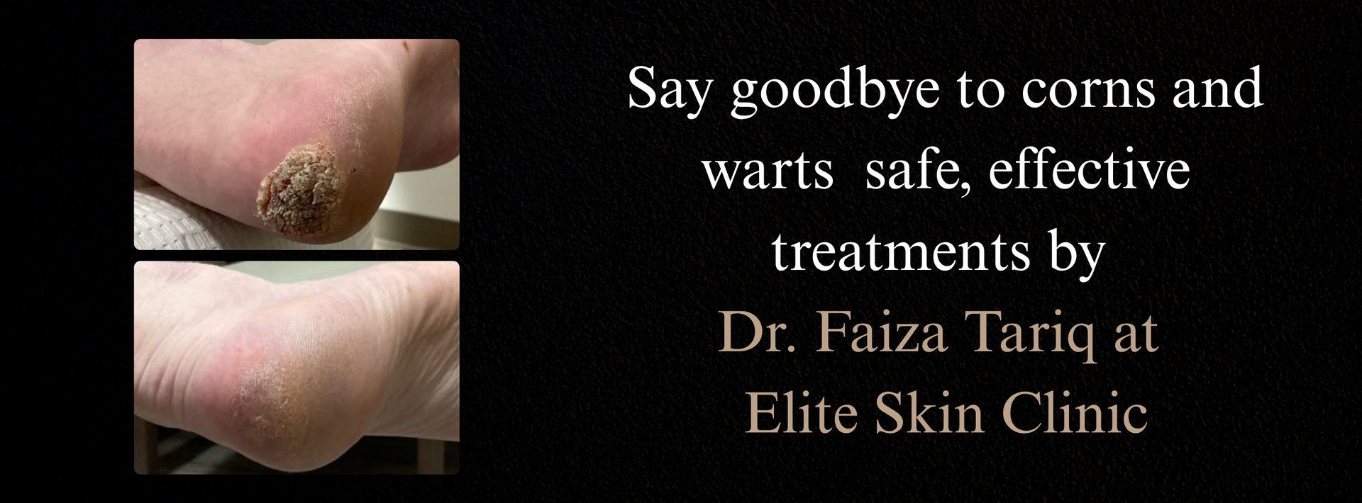 Dealing with painful corns or stubborn warts? At Elite Skin Clinic, Dr. Faiza Tariq (MBBS, FCPS – Dermatology) offers advanced, non-invasive treatments to remove corns and warts safely, quickly, and with minimal discomfort — so you can walk confidently and live comfortably again.